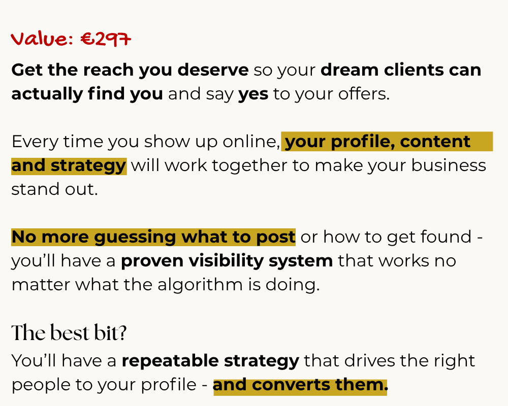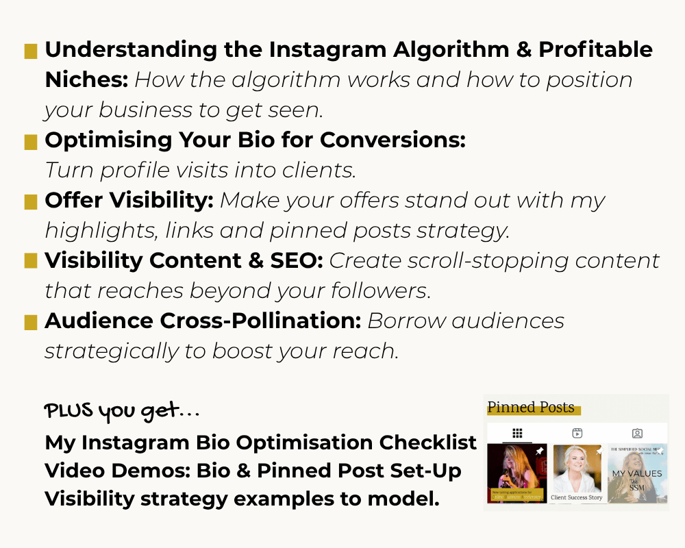 In this course, you'll learn how to optimise your profile (so your dream clients can find you) master visibility content (to get more reach) and borrow audiences strategically so you're seen by the people who actually want what you sell.