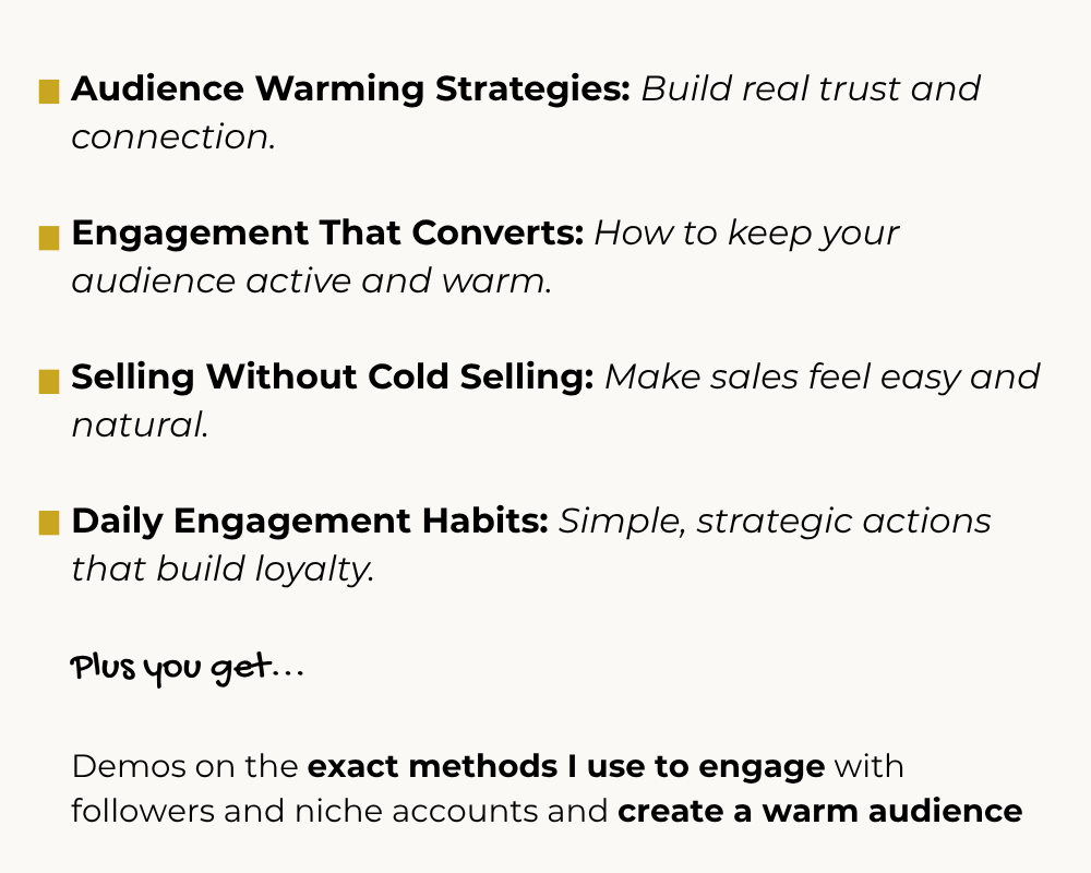 I'll show you how to nurture followers into loyal buyers through engagement strategies, trust building methods and simple daily actions that WORK - no cold DMing required!