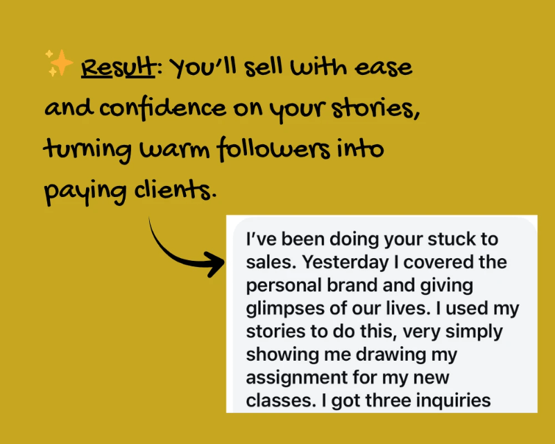 After learning my story sales method, your stories will build trust, connection and authority with your warmest audience, helping you sell without ever feeling pushy or fake.