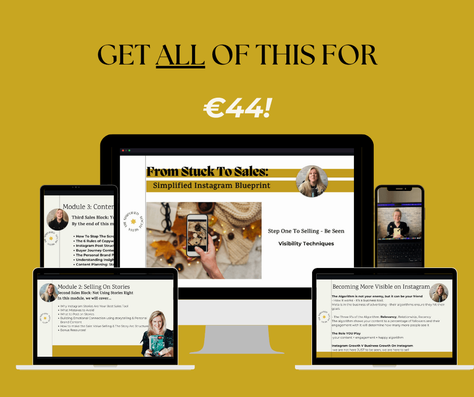 I’m on a mission to simplify Instagram for entrepreneurs, and that starts with this course.I designed this mini-course to remove the sales blocks on your Instagram account so you can get the best results while minimising the time you spend on your phone.