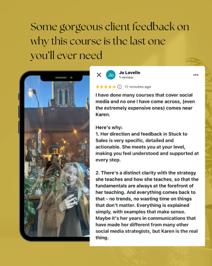 Unlike other courses that rely on trending audios and vague strategies that don't stand the test of time, From Stuck To Sales is built on tried and tested methods that I have been using to make sales, for myself AND for hundreds of other businesses since 2015.